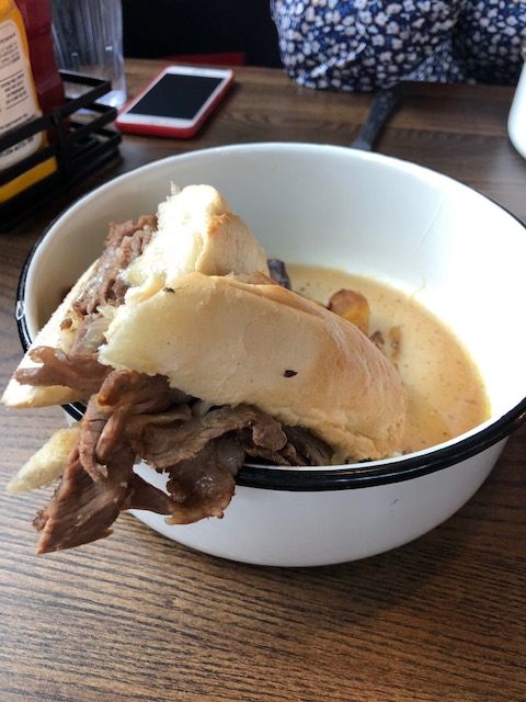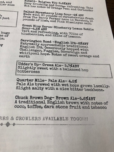 We recommend Udder’s up cream ale and Quarter Mile pale ale and the French dip (original for Daphne and the Swiss for Darlene).