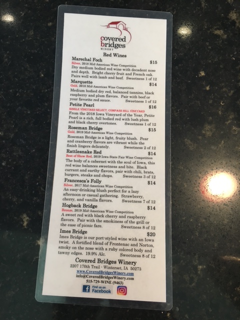 For a hearty, reasonably priced meal, we recommend the China Cafe in Winterset. If you like wine and have the time, stop at Covered Bridges Winery 2207 170th Trail, Winterset. They have a very attractive facility, friendly people, and good wines. Darlene recommends Rattlesnake Red and Marquette.