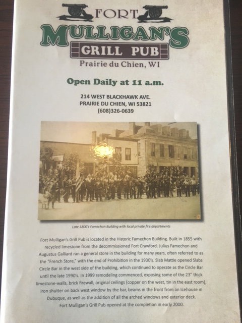 We had lunch at Fort Mulligan’s Grill Pub in Prairie du Chien. (We recommend the reuben and the French dip.)